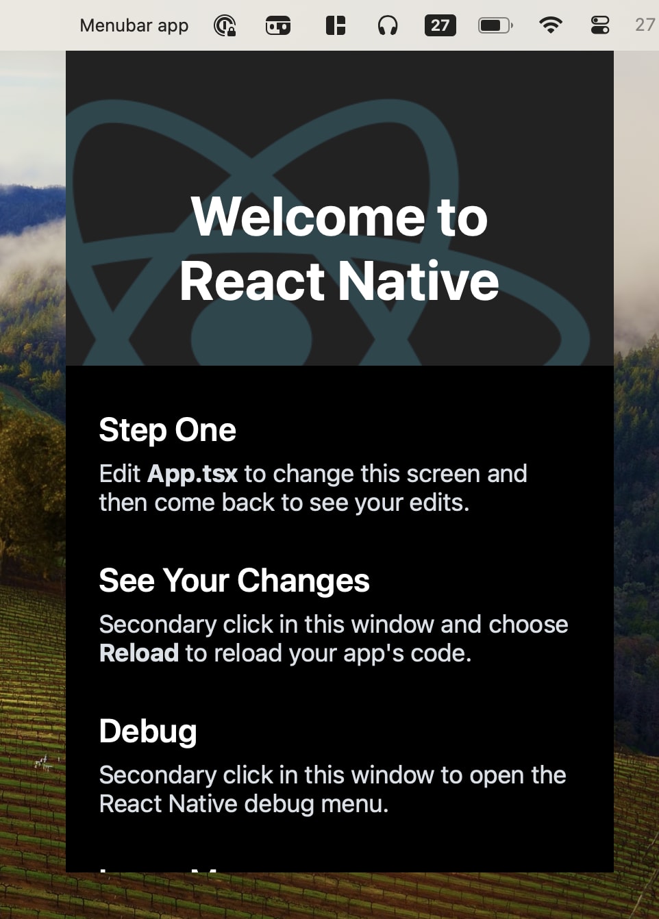 npx react-native@latest init MenuBarApp --template "react-native@^0.72.0" The stable version of MacOS might be different by the time you are reading this article so check out react-native-macos docs.