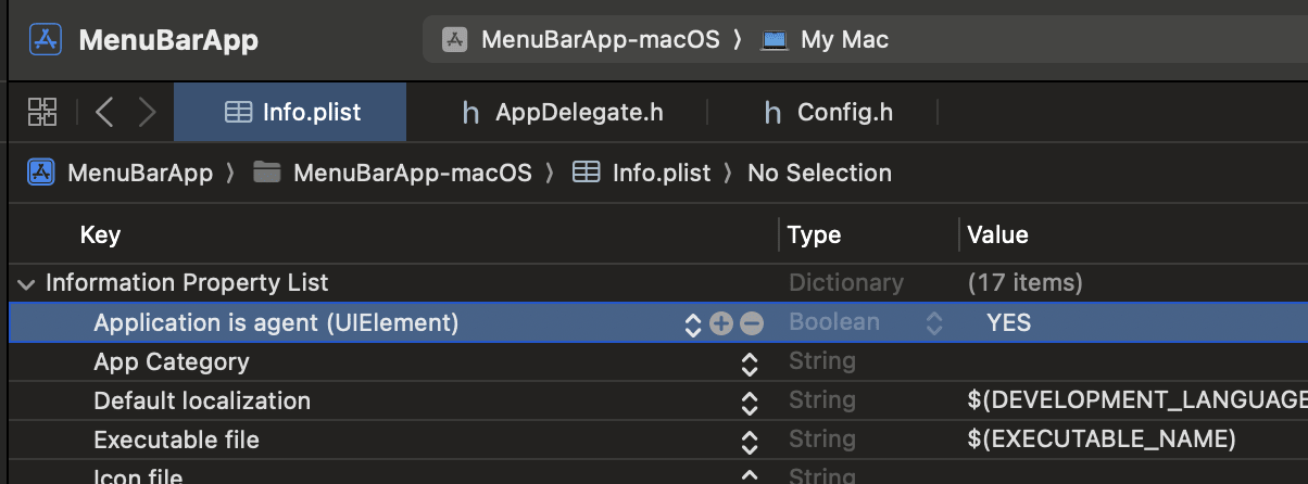 }Next important step is to go to your Info.plist and add new property Application is agent (UIElement) and set it to YES. This will remove your app icon from Dock.