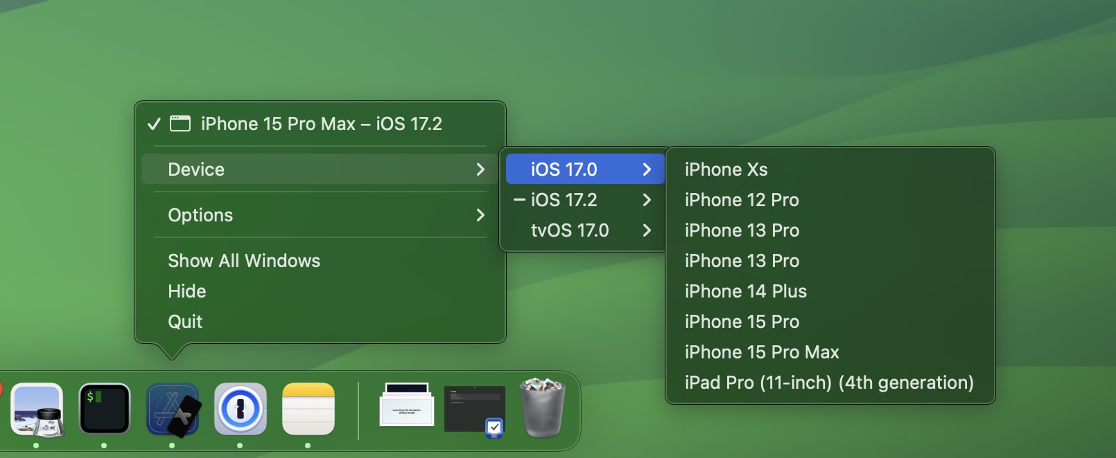 xcrun simctl boot "iPhone 15 Pro"Launching a simulator from dock