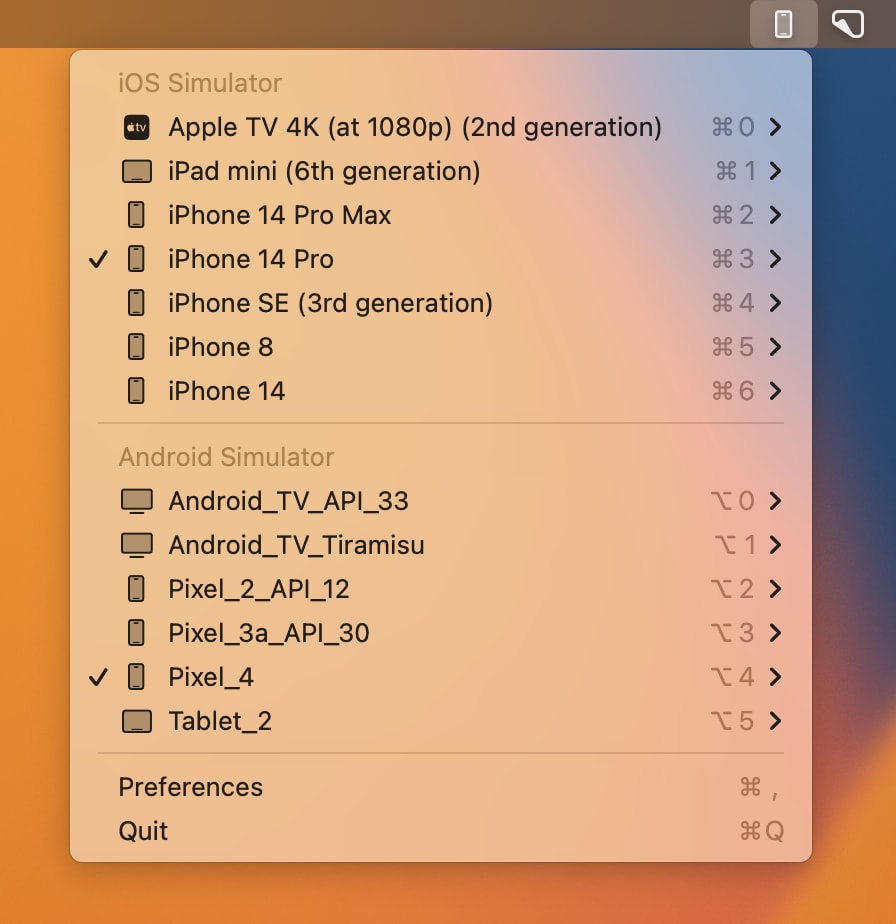 Third way of launching simulators is by using Minisim a free and open source app that allows you to launch simulators from the menu bar. It also allows you to launch Android emulators, execute custom commands and more.